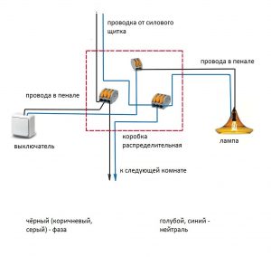 Таким же образом устанавливаются распаечные коробки. Распаечные/распределительные коробки нужны в случае разветвлённой проводки, чтобы не прерывать цепь, идущую через выключатель освещения к розетке (через распределительную коробку проводится самостоятельный провод — к розетке и самостоятельный провод — через выключатель к освещению).