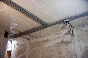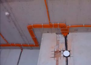 В некоторых случаях возможна проводка по потолку в квартире, но это бывает редко. Дело в том, что в обычных квартирах потолок выложен из цокольных плит и поэтому, прокладка затруднительна и не эстетична. Чаще всего, такая проводка используется в промышленных помещениях, без перегородок, имеющих большую площадь, с подвесными потолками или в магазинах – супермаркетах.